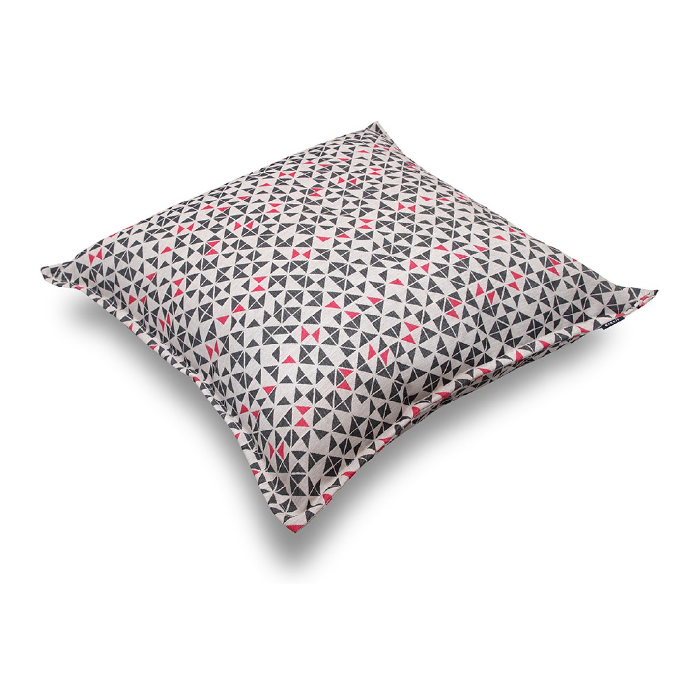 Μαξιλάρα δαπέδου με γκρι και ροζ γεωμτερικά σχέδια, τύπου φάκελος με διακοσμητική περιμετρική πατούρα και επενδυμένο με ύφασμα Ζακάρ, εξαιρετικής ποιότητας για αντοχή στο χρόνο.